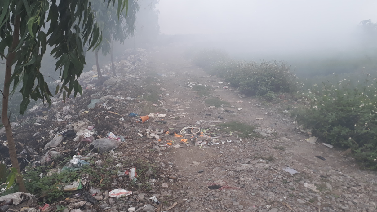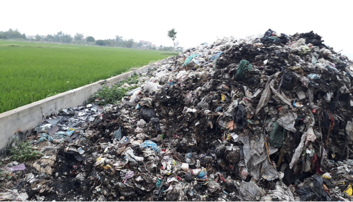 Bãi rác lộ thiên này được xây dựng thủ công bằng gạch táp lô, phân thành nhiều ô khác nhau với diện tích trên dưới 20 m2. Đây được xem là bãi tập kết rác chính nên hầu hết tất cả các loại rác từ rác sinh hoạt, phế thải xây dựng đến xác động vật… đều được vận chuyển về đây. Rác bị đổ chồng đống, tràn ra ruộng của người dân, văng xuống kênh thủy lợi nội đồng gây tắc nghẽn dòng chảy và khiến vi khuẩn phát tán khắp nơi.